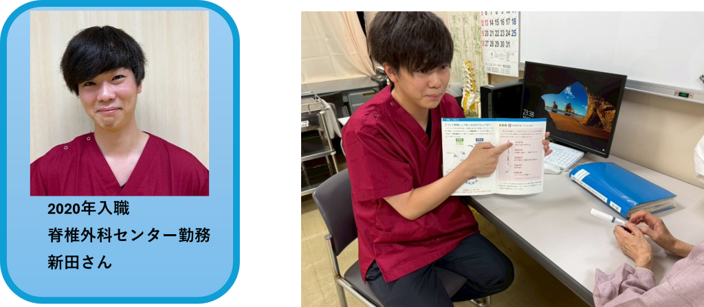 私は、R7年度から骨粗鬆症マネージャーの資格を取得し玉造病院の骨粗鬆症・転倒予防チーム「TAMATSUKU RE:BONE」のメンバーとして活動しています。私が所属する脊椎外科センターにも骨粗鬆症による脆弱性骨折で入院となる患者さんが多く、その方々をサポートしたいと思い骨粗鬆症マネージャーの勉強を始めました。現在の活動は毎月2回骨粗鬆症外来にて患者さんへの問診や指導、週1回の骨粗鬆症カンファレンスで検討した内容をスタッフにも共有し日々の患者さんへの指導に役立てています。自身の活動の幅が広がったのを感じ楽しく働いています。