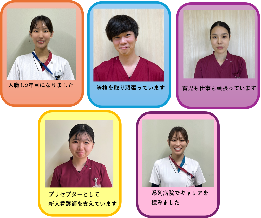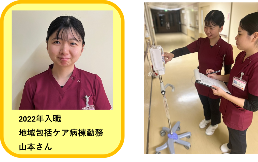 私は、系列病院の急性期病棟に約3か月間応援として勤務する機会をいただきました。はじめは慣れない環境下で業務を行うことに大きな不安もありましたが、スタッフの皆様に温かく迎えていただき、とても充実した日々を過ごすことができました。特に自施設では経験することのない医療や看護技術、多様な症例をみることができ、看護の幅を広げる貴重な経験となりました。また、この経験は今後の看護に対するモチベーションの向上や自己成長へのきっかけにもなっています。様々な経験を積むことで目標や希望は変化しますが、病院間の繋がりがあることで組織内で自分に合ったキャリアアップを考えることができると感じています。